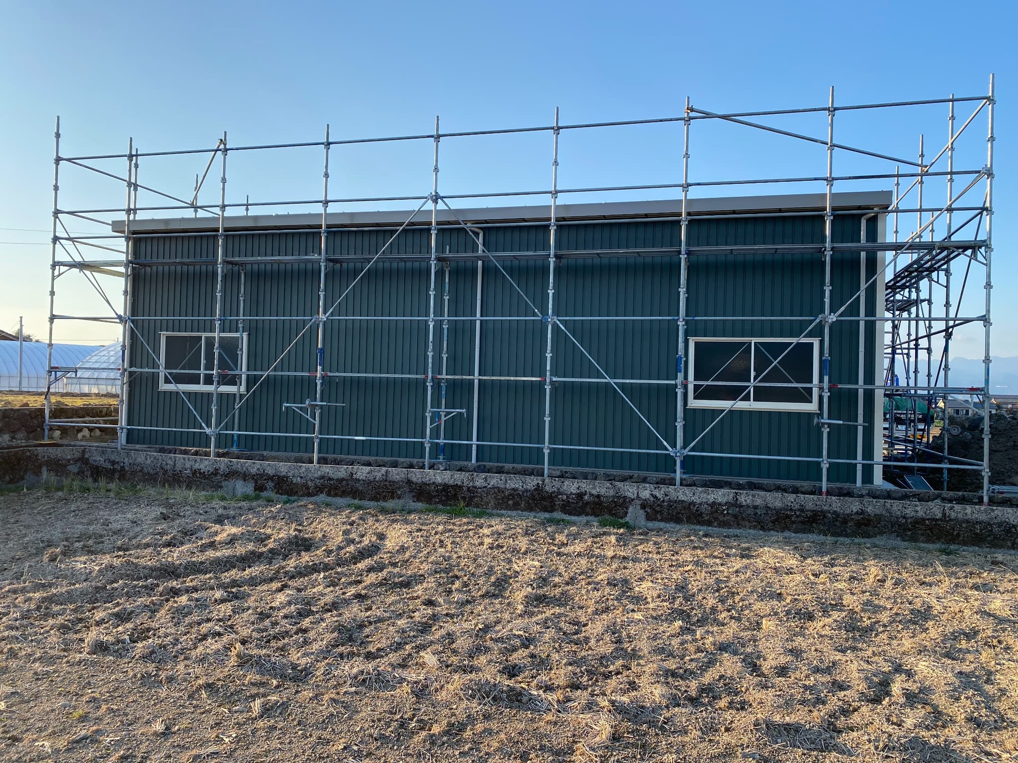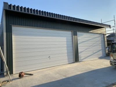 オーバースライダーシャッター使用の倉庫になります。 外壁は緑です。僕はこの色が好きです。